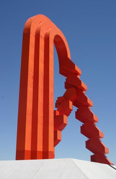 La plataforma piramidal representa el mestizaje de la zona, evocando las pirámides y asentamientos prehispánicos que una vez florecieron aquí. La cascada de formas geométricas rinde homenaje a los pueblos de Paquimé, mientras que el arco de medio punto con una columna contrafuerte recuerda las primeras misiones españolas en la región. La Puerta de Chihuahua no solo es una obra de arte, sino también un poderoso recordatorio de la historia y la identidad.